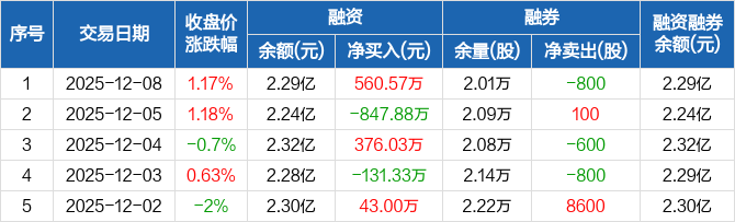 融资方面,当日融资买入1131.91万元,融资偿还571.34万元,融资净买入560.57万元。融券方面,融券卖出100股,融券偿还900股,融券余量2.01万股,融券余额26.13万元。融资融券余额合计2.29亿元。