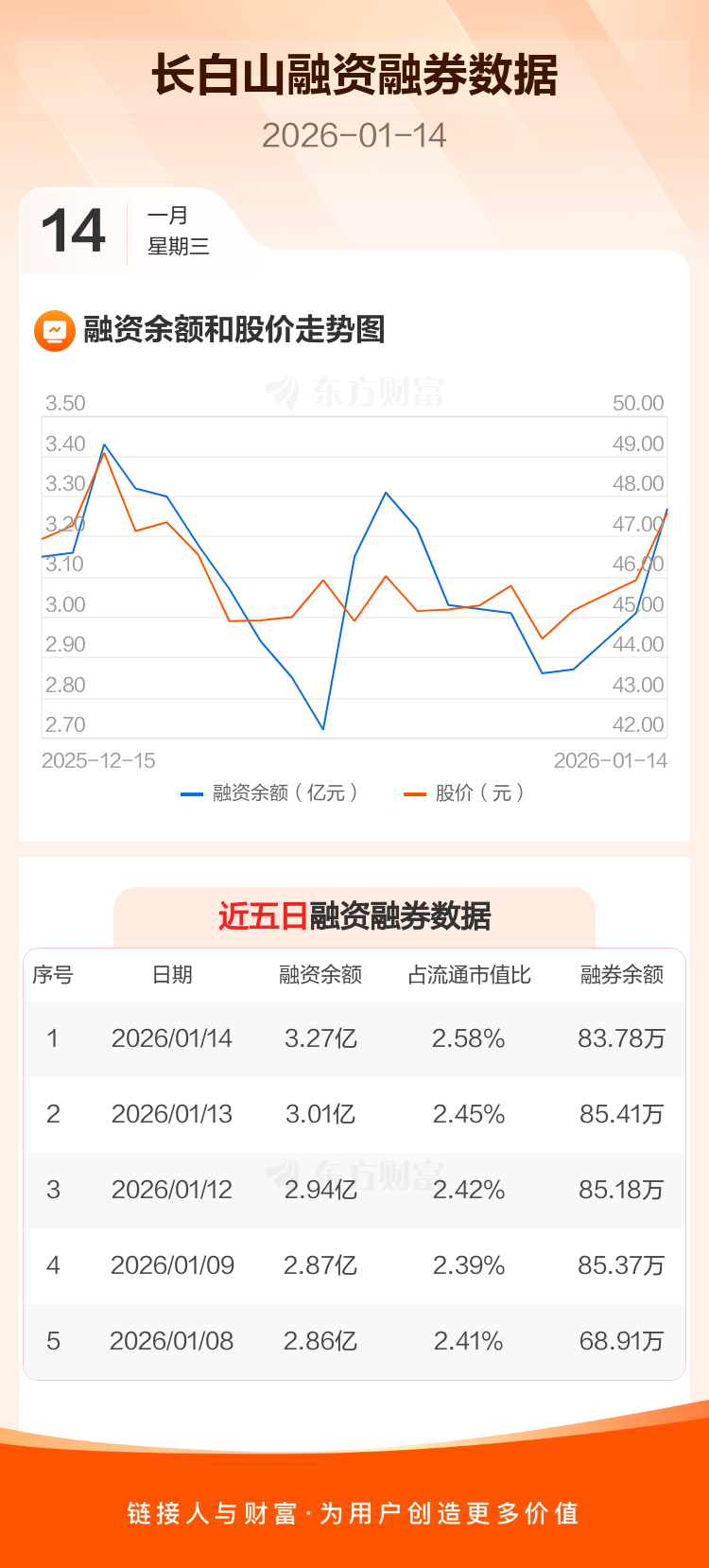 交易所最新数据显示,长白山于2026年1月14日获融资买入8106.22万元,融资偿还5466.07万元,当日融资净买入2640.14万元。目前,该股融资余额3.27亿,占流通市值比例为2.58%。