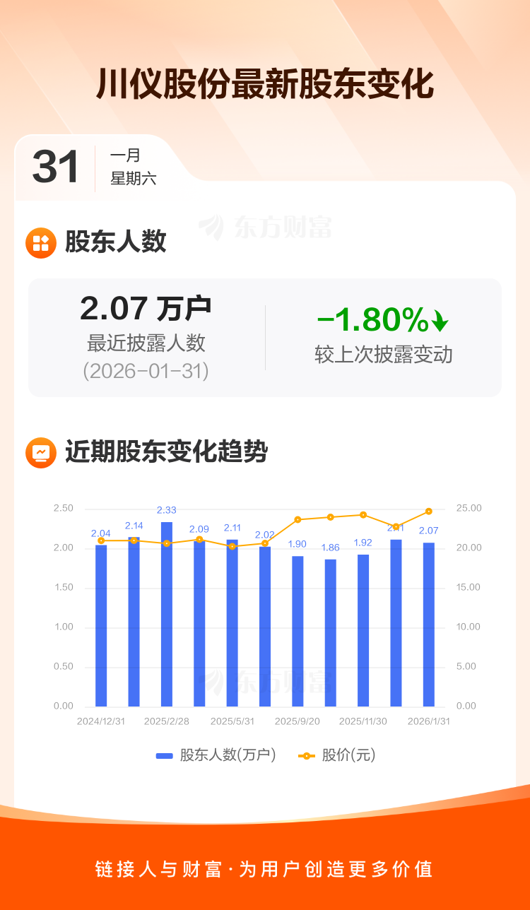川仪股份:截至1月31日最新股东户数2.07万户,较上期减少1.80%