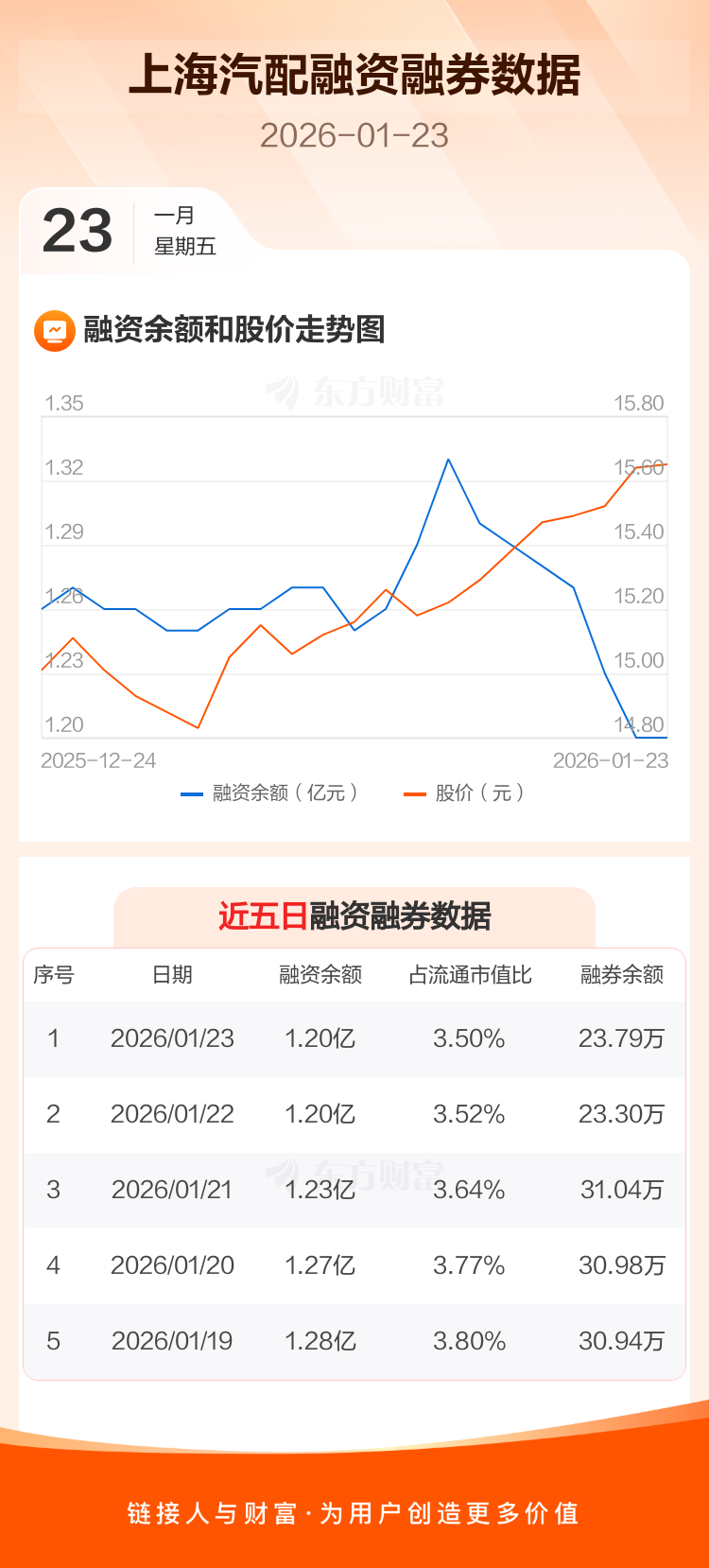 交易所最新数据显示,上海汽配于2026年1月23日获融资买入536.44万元,融资偿还585.52万元,当日融资净偿还49.08万元。目前,该股融资余额1.20亿,占流通市值比例为3.50%。