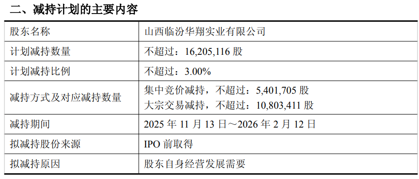10月21日晚间,华翔股份(603112)发布公告,控股股东山西临汾华翔实业有限公司因自身经营发展需要,计划自2025年11月13日至2026年2月12日期间,通过集中竞价和大宗交易方式,合计减持不超过1621万股,占公司总股本的3%。