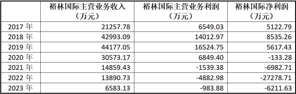 2020年开始,裕林国际持续亏损。2022年,该公司净利润一度亏损约2.73 亿元,直至2023年“出表”时仍亏损6211.63万元。