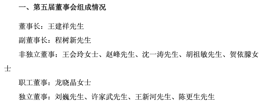 经审议,同意选举王建祥为公司第五届董事会董事长,任期自本次董事会会议审议通过之日起至第五届董事会届满之日止。胡祖敏不再担任公司董事长。根据相关规定,王建祥担任公司董事长后同时担任公司法定代表人。