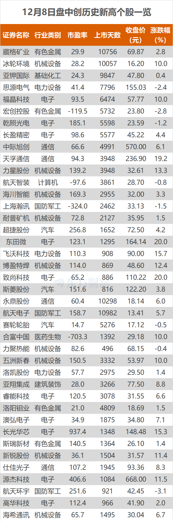 12月8日,A股三大指数今日集体收涨,沪指涨0.54%,收报3924.08点;深证成指涨1.39%,收报13329.99点;创业板指涨2.60%,收报3190.27点。东方财富Choice数据显示,今日有40只个股盘中股价创历史新高,分别为合富中国、天孚通信等。