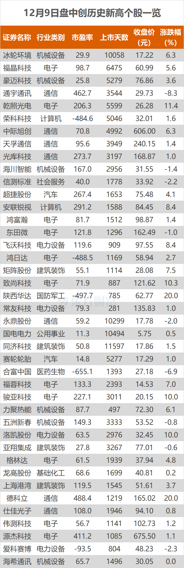 12月9日,A股三大指数今日涨跌不一,截止收盘,沪指跌0.37%,收报3909.52点;深证成指跌0.39%,收报13277.36点;创业板指涨0.61%,收报3209.60点。东方财富Choice数据显示,今日有41只个股盘中股价创历史新高,分别为合富中国、中际旭创等。