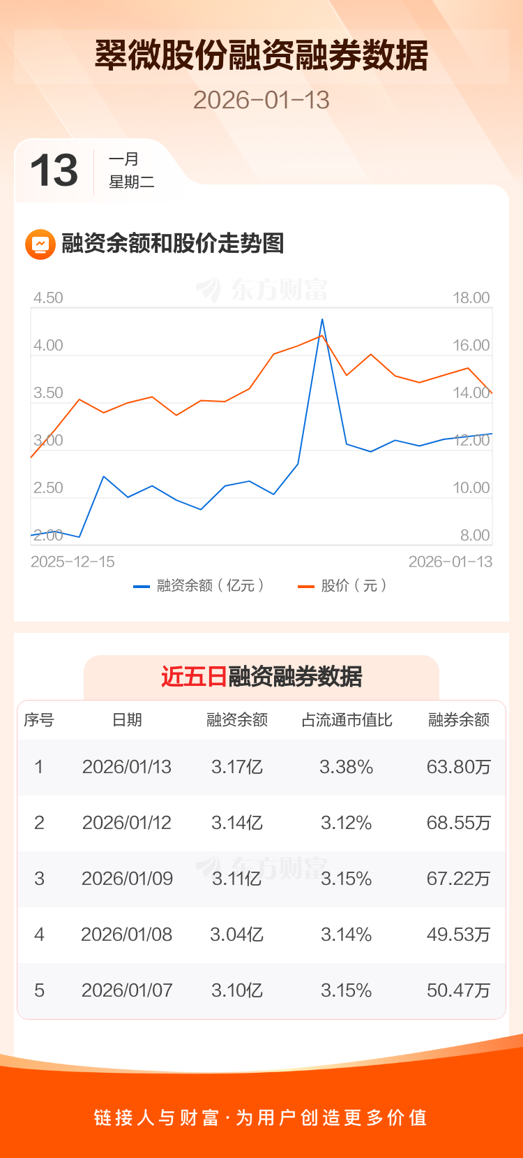 交易所最新数据显示,翠微股份于2026年1月13日获融资买入8168.59万元,融资偿还7879.46万元,当日融资净买入289.13万元。目前,该股融资余额3.17亿,占流通市值比例为3.38%。