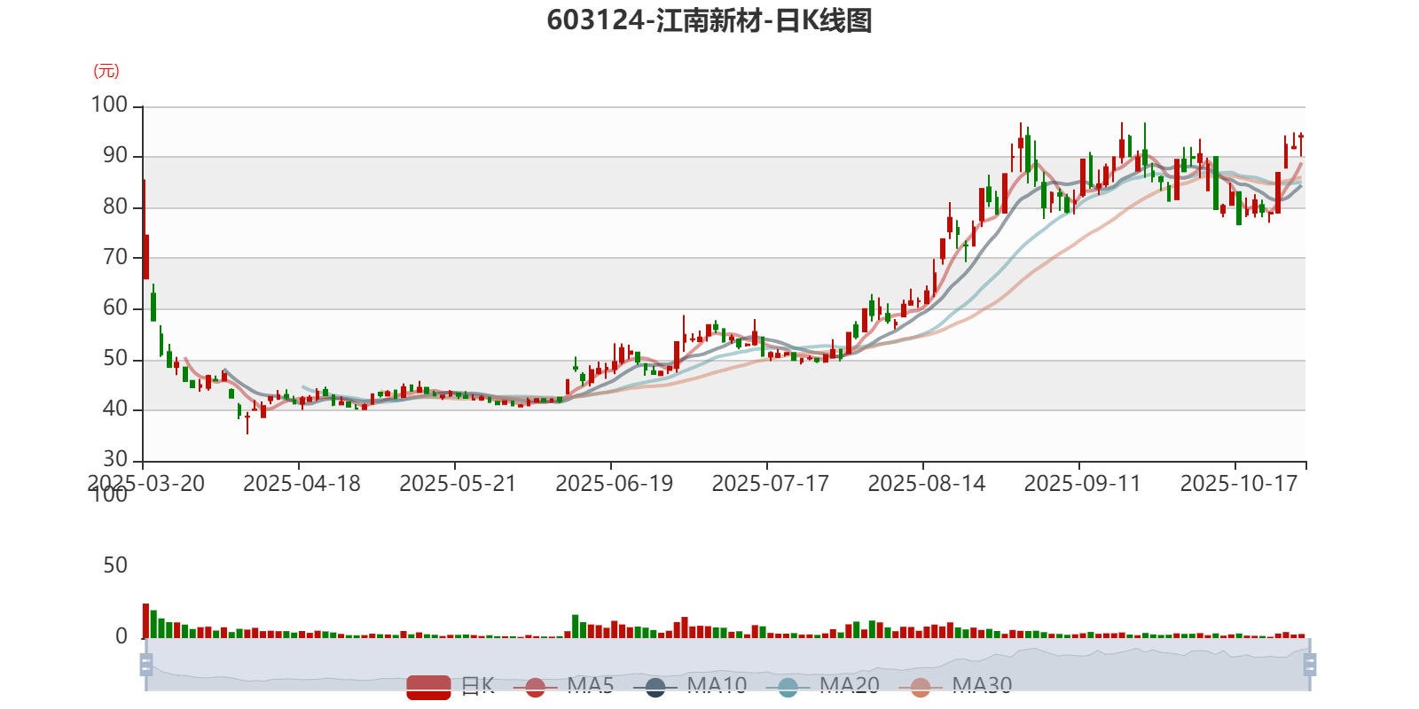 中证智能财讯江南新材(603124)10月30日披露2025年第三季度报告。前三季度公司实现营业总收入75.69亿元,同比增长18.34%;归母净利润1.65亿元,同比增长21.95%;扣非净利润1.5亿元;经营活动产生的现金流量净额为-3.89亿元,上年同期为-9.04亿元;报告期内,江南新材基本每股收益为1.24元,加权平均净资产收益率为9.97%。