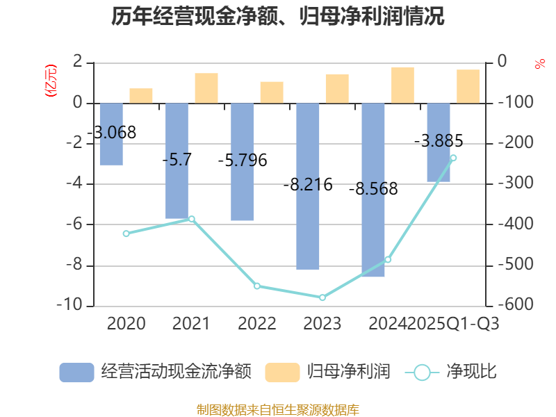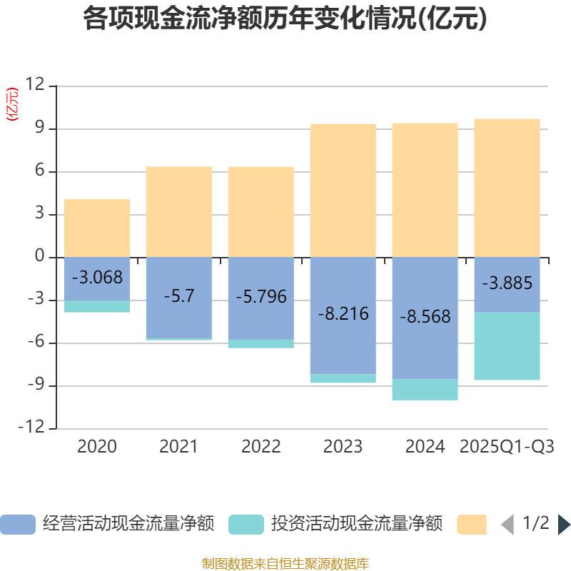 2025年前三季度,公司经营活动现金流净额为-3.89亿元,同比增加5.16亿元;筹资活动现金流净额9.66亿元,同比增加6139.42万元;投资活动现金流净额-4.73亿元,上年同期为-1.2亿元。