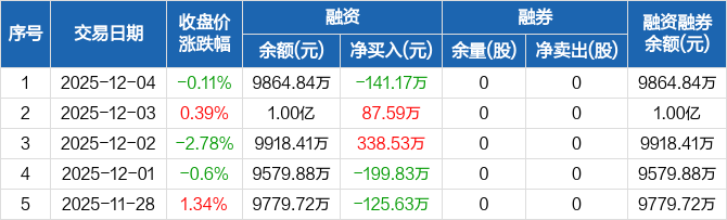 江南新材:融资净偿还141.17万元,融资余额9864.84万元(12-04)