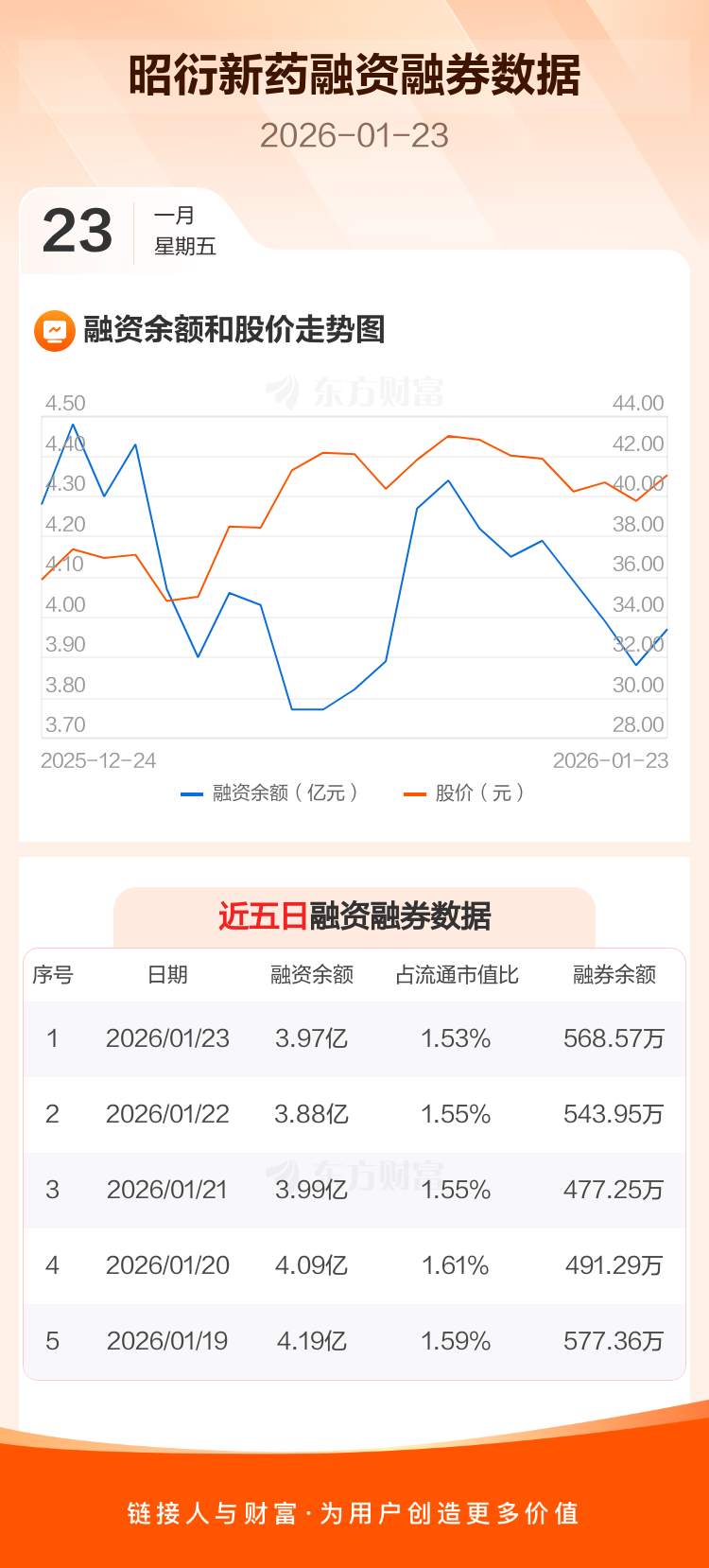 交易所最新数据显示,昭衍新药于2026年1月23日获融资买入6061.71万元,融资偿还5181.44万元,当日融资净买入880.27万元。目前,该股融资余额3.97亿,占流通市值比例为1.53%。