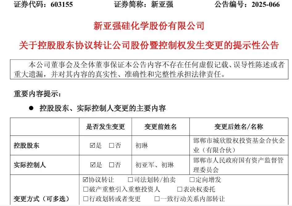 公告显示,昨日(11月24日),新亚强控股股东、实际控制人之一初琳与邯郸市城欣股权投资基金合伙企业(有限合伙)(简称“城欣基金”)签署了股份转让协议,约定初琳将其持有的9442.03万股股份转让给城欣基金。城欣基金由邯郸市国资委旗下邯郸市城运融通控股有限公司作为有限合伙人,持有99%份额。