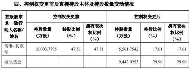 如本次股权转让顺利实施,城欣基金将持有新亚强29.9%股份,成为公司控股股东。不过,初琳并未将其所持的股份全部转让——本次转让后,其仍持股16.09%;初琳及一致行动人初亚军仍合计持股17.61%。