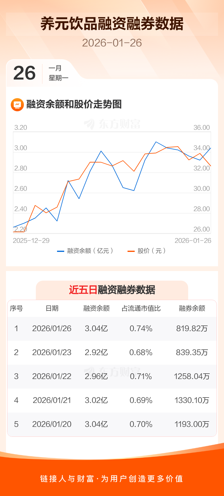 交易所最新数据显示,养元饮品于2026年1月26日获融资买入3410.60万元,融资偿还2196.48万元,当日融资净买入1214.12万元。目前,该股融资余额3.04亿,占流通市值比例为0.74%。