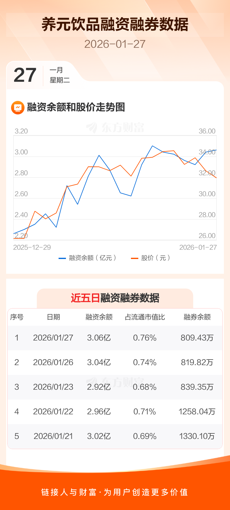 交易所最新数据显示,养元饮品于2026年1月27日获融资买入2374.91万元,融资偿还2139.58万元,当日融资净买入235.33万元。目前,该股融资余额3.06亿,占流通市值比例为0.76%。