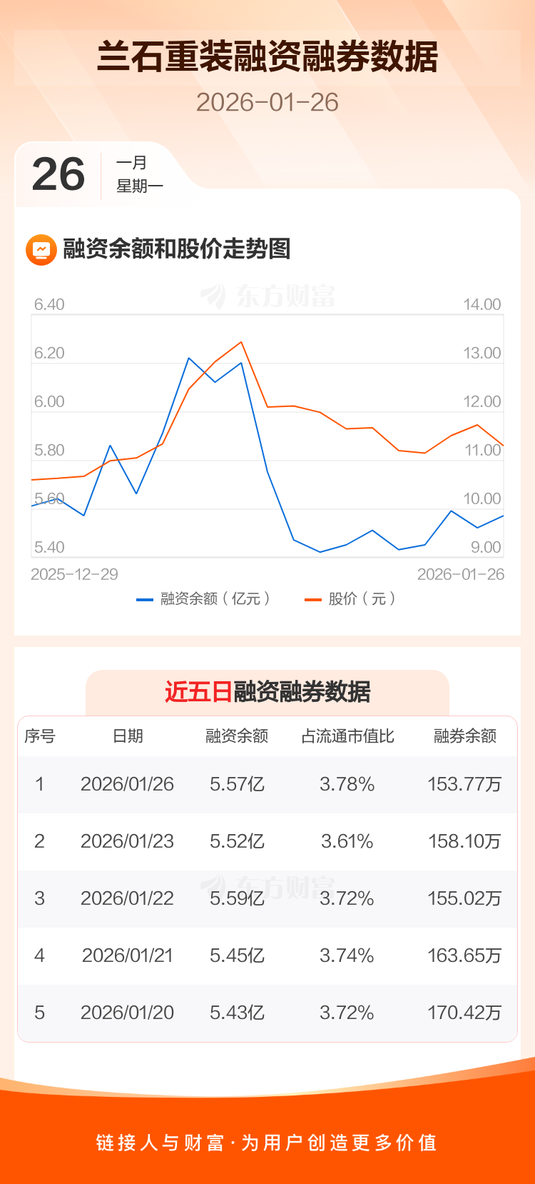 交易所最新数据显示,兰石重装于2026年1月26日获融资买入4523.88万元,融资偿还4074.19万元,当日融资净买入449.69万元。目前,该股融资余额5.57亿,占流通市值比例为3.78%。