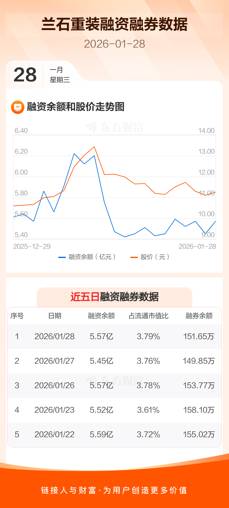 交易所最新数据显示,兰石重装于2026年1月28日获融资买入3826.87万元,融资偿还2573.30万元,当日融资净买入1253.57万元。目前,该股融资余额5.57亿,占流通市值比例为3.79%。