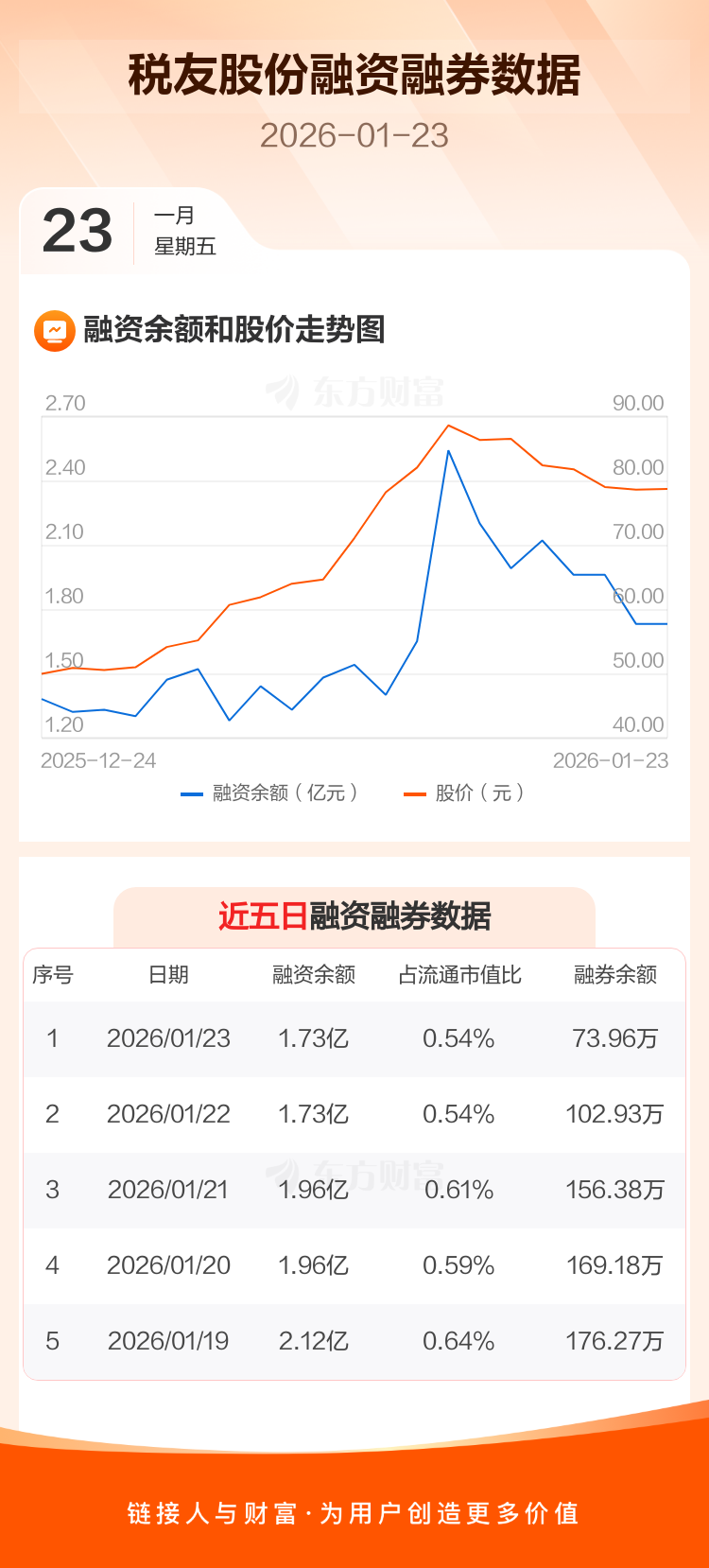 交易所最新数据显示,税友股份于2026年1月23日获融资买入4740.68万元,融资偿还4783.89万元,当日融资净偿还43.21万元。目前,该股融资余额1.73亿,占流通市值比例为0.54%。