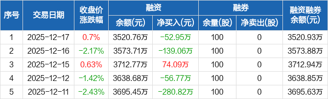万丰股份:融资净偿还52.95万元,融资余额3520.76万元(12-17)