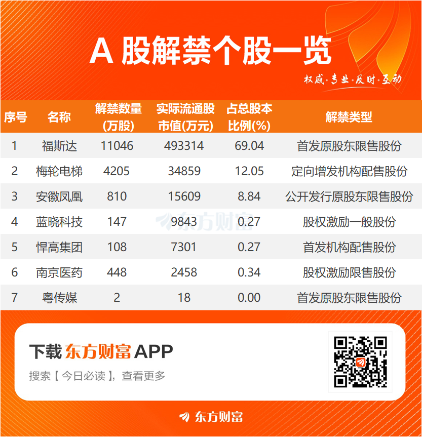 【明日解禁】明日7股解禁 福斯达、梅轮电梯解禁市值居前