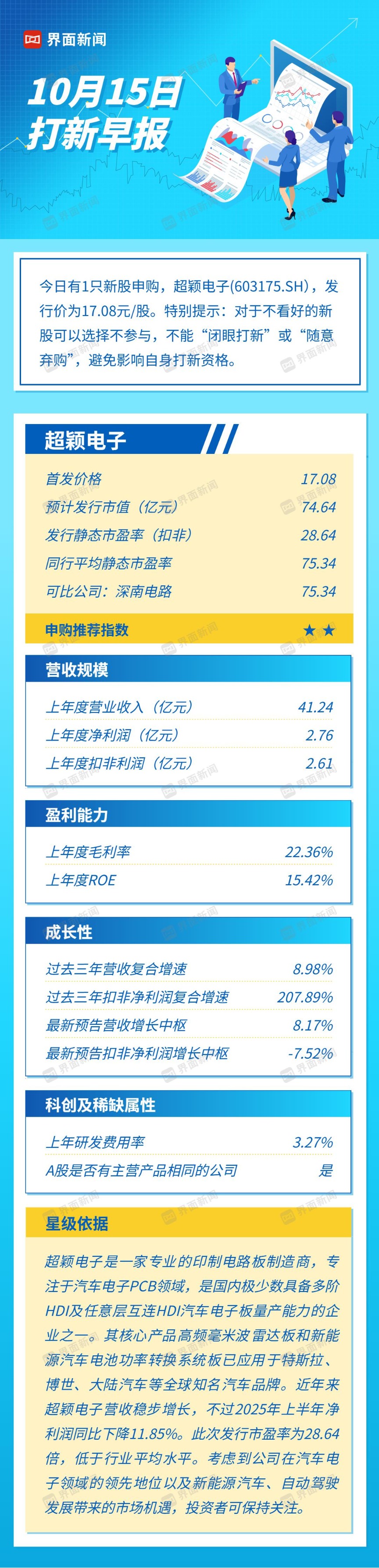 今日有1只新股申购,超颖电子(603175.SH),发行价为17.08元/股。特别提示:对于不看好的新股可以选择不参与,不能“闭眼打新”或“随意弃购”,避免影响自身打新资格。