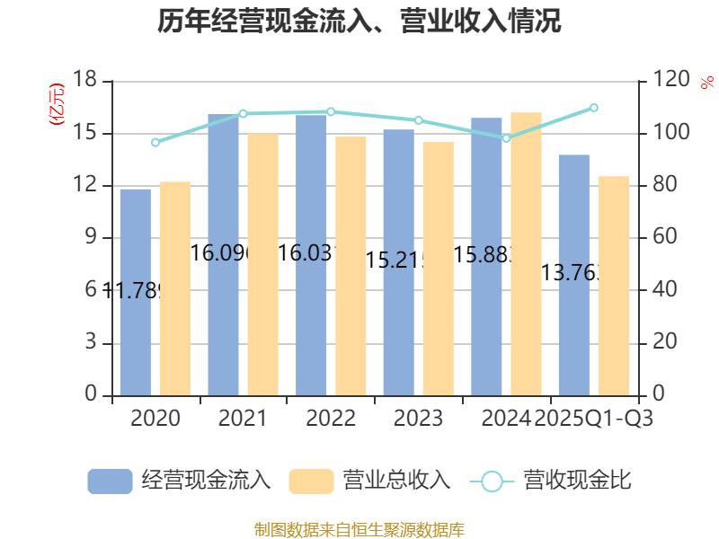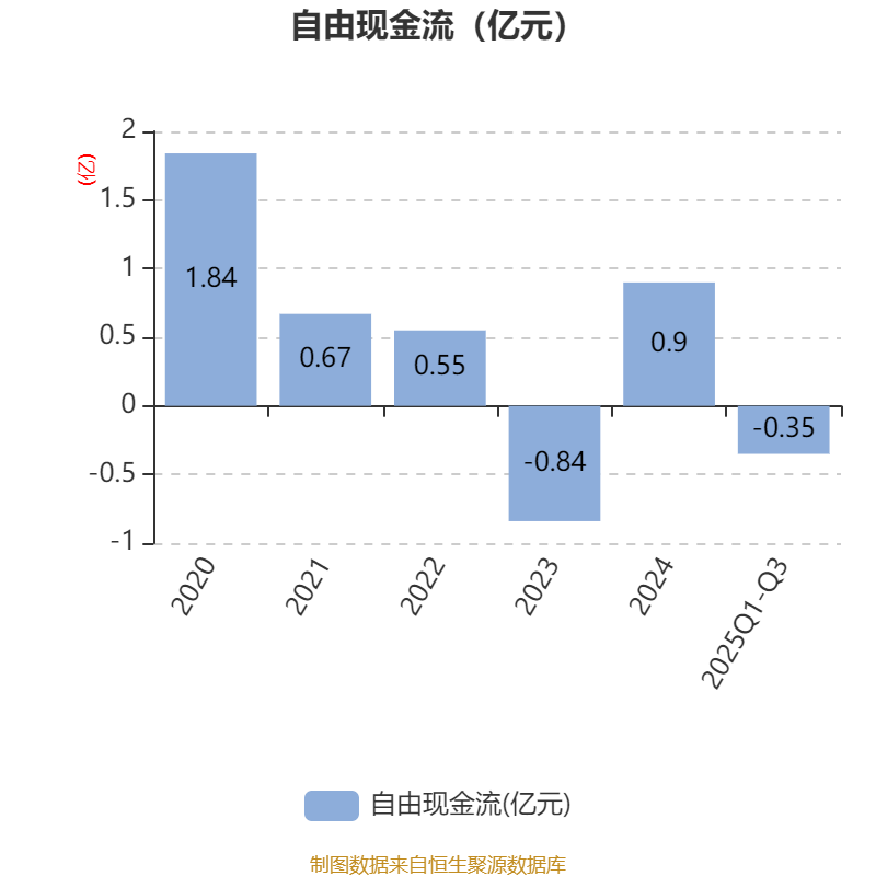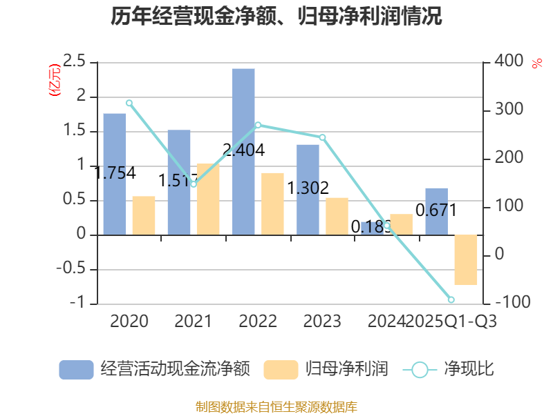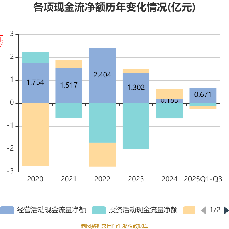 2025年前三季度,公司经营活动现金流净额为6713.95万元,同比增长8.7%;筹资活动现金流净额-1380.2万元,同比减少9808.09万元;投资活动现金流净额-1205.84万元,上年同期为-6757.42万元。