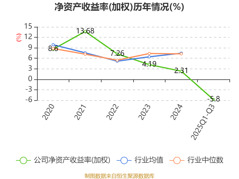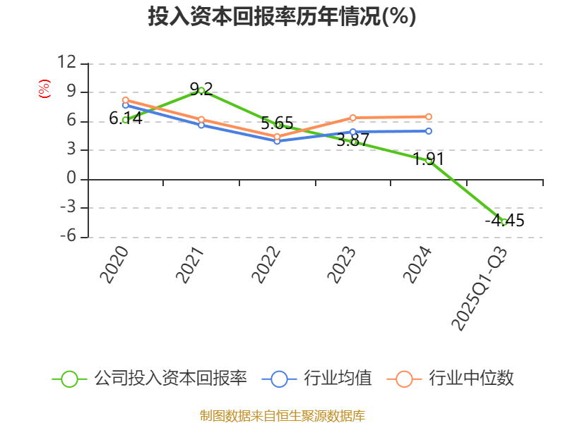 盈利能力方面, 2025年前三季度公司加权平均净资产收益率为-5.8%,同比下降6.34个百分点。公司2025年前三季度投入资本回报率为-4.45%,较上年同期下降4.95个百分点。