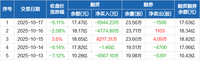 新泉股份:融资净偿还6944.23万元,融资余额17.47亿元(10-17)