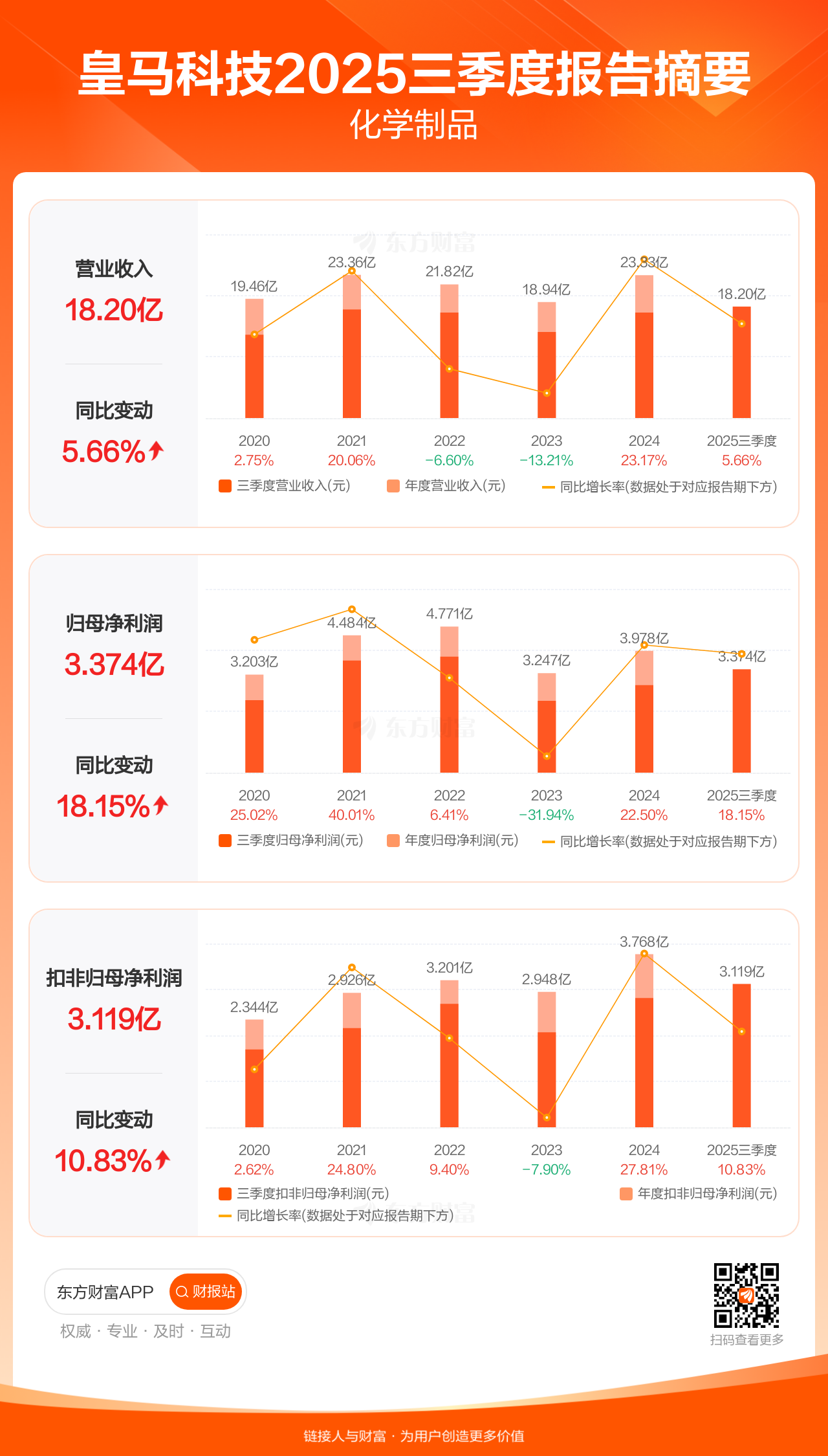 皇马科技10月29日发布2025年三季报显示,公司前三季实现营业收入18.20亿元,同比增长5.66%;归母净利润3.37亿元,同比增长18.15%;扣非归母净利润3.12亿元,同比增长10.83%。
