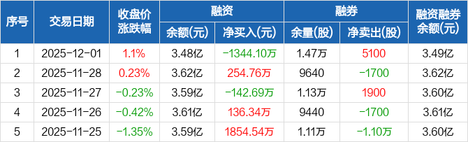 公牛集团融资融券信息显示,2025年12月1日融资净偿还1344.1万元;融资余额3.48亿元,较前一日下降3.72%。