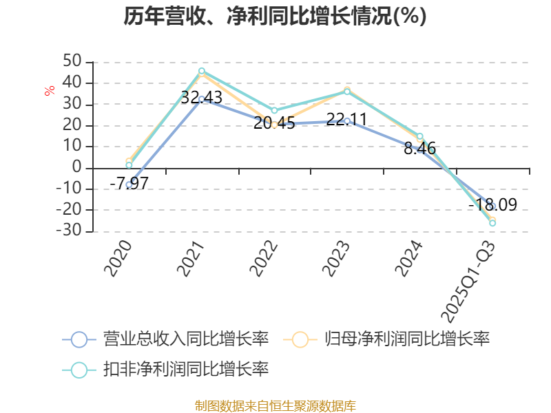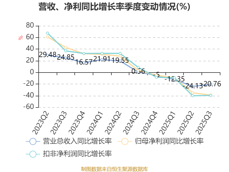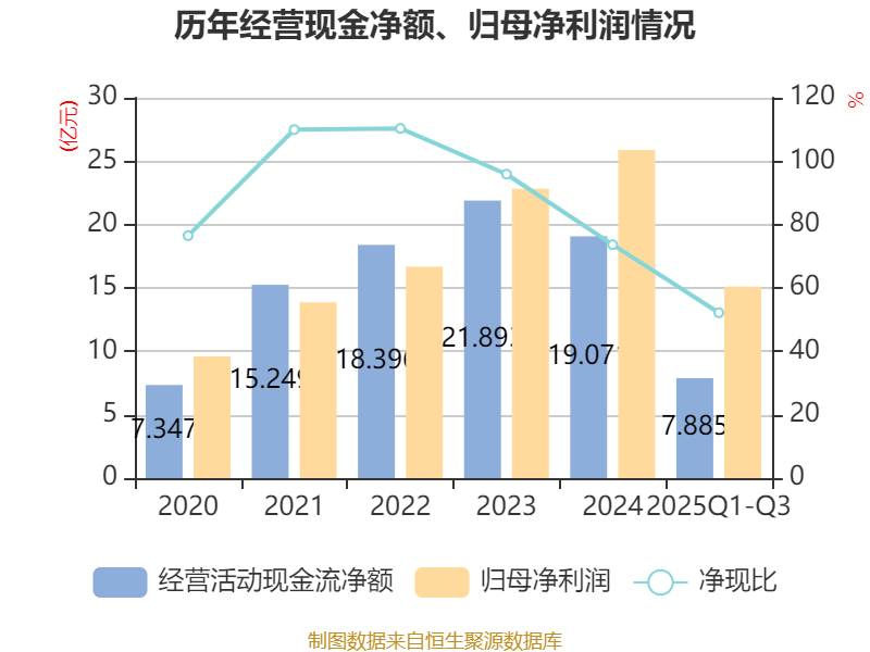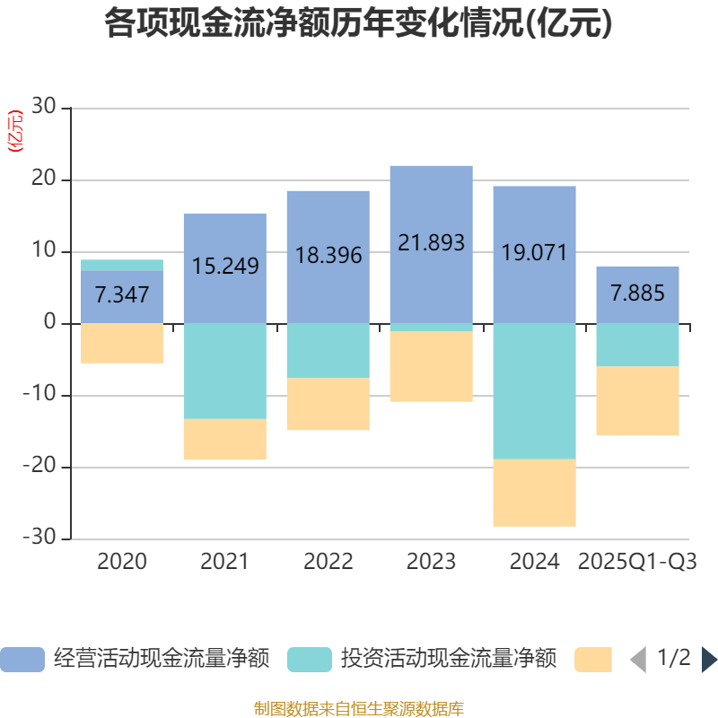 2025年前三季度,公司经营活动现金流净额为7.89亿元,同比下降38.13%;筹资活动现金流净额-9.58亿元,同比增加1.41亿元;投资活动现金流净额-6.07亿元,上年同期为-4.55亿元。