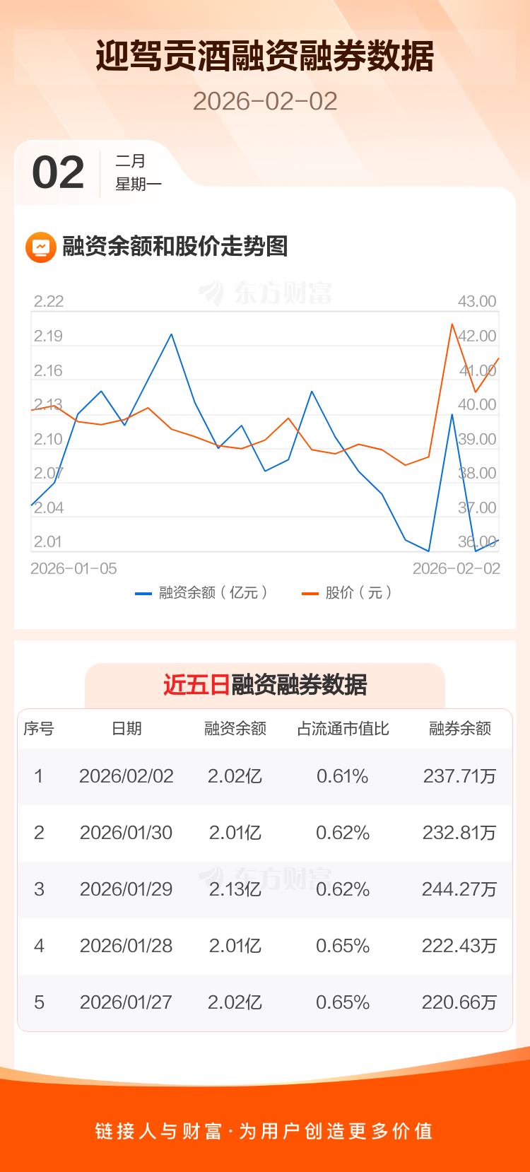 交易所最新数据显示,迎驾贡酒于2026年2月2日获融资买入2899.05万元,融资偿还2847.66万元,当日融资净买入51.38万元。目前,该股融资余额2.02亿,占流通市值比例为0.61%。