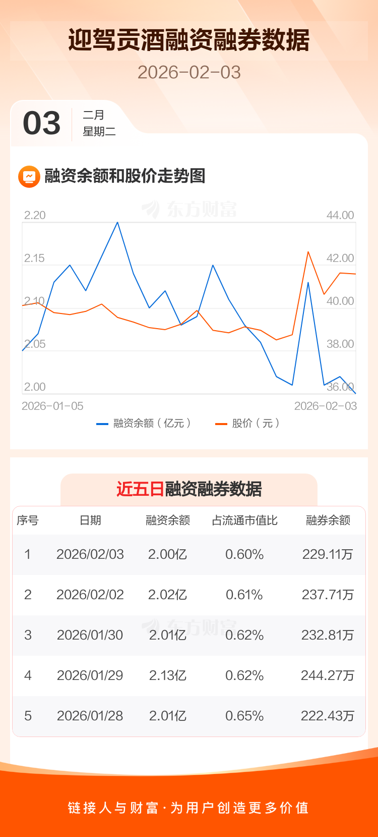 交易所最新数据显示,迎驾贡酒于2026年2月3日获融资买入2179.70万元,融资偿还2364.54万元,当日融资净偿还184.84万元。目前,该股融资余额2.00亿,占流通市值比例为0.60%。