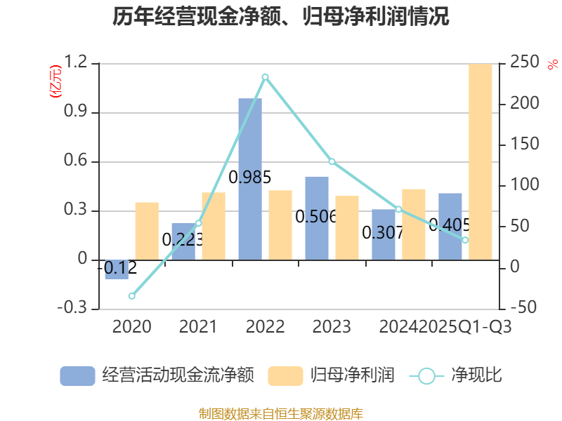 2025年前三季度,公司经营活动现金流净额为4047.68万元,同比增长1565.85%;筹资活动现金流净额1.48亿元,同比增加1.13亿元;投资活动现金流净额-7934.81万元,上年同期为-1.38亿元。