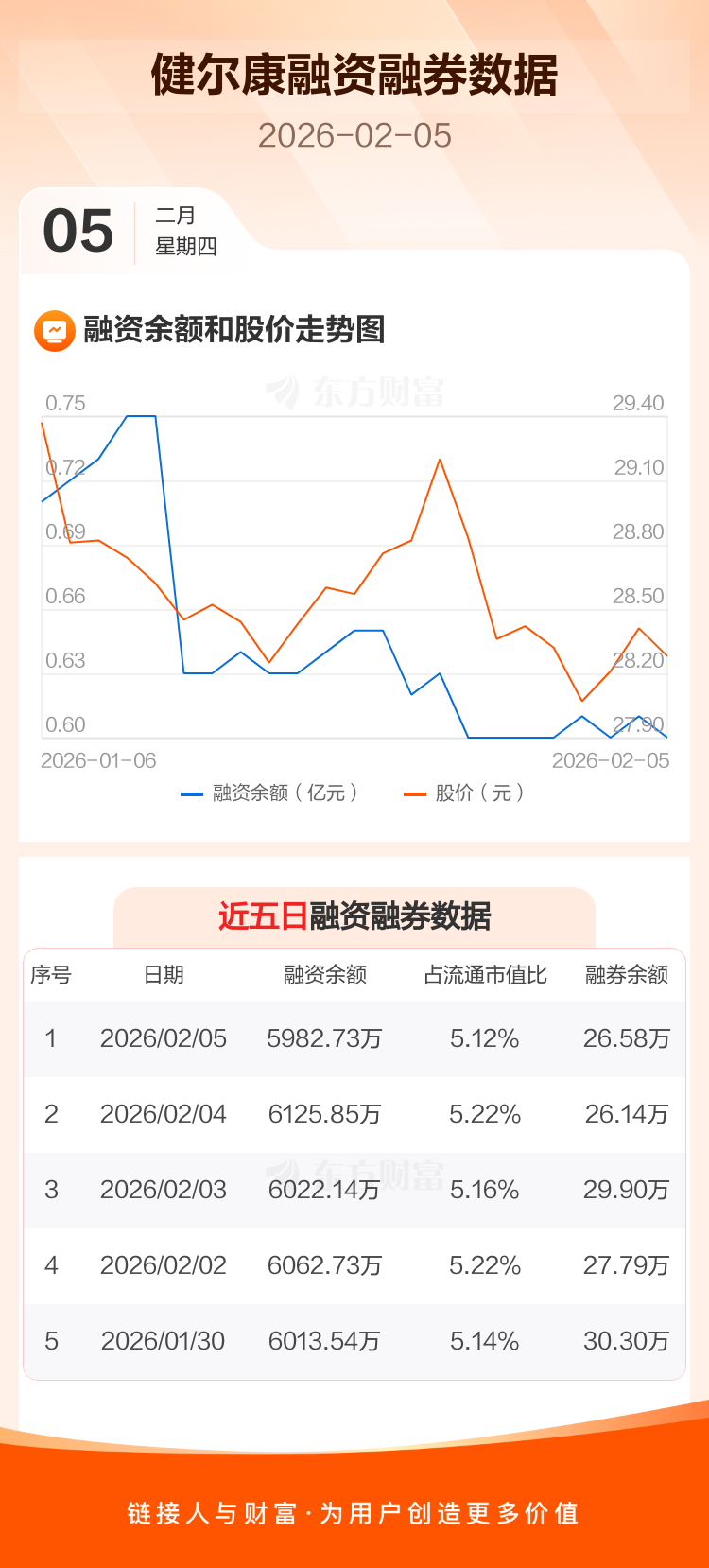 交易所最新数据显示,健尔康于2026年2月5日获融资买入173.31万元,融资偿还316.43万元,当日融资净偿还143.12万元。目前,该股融资余额5982.73万,占流通市值比例为5.12%。