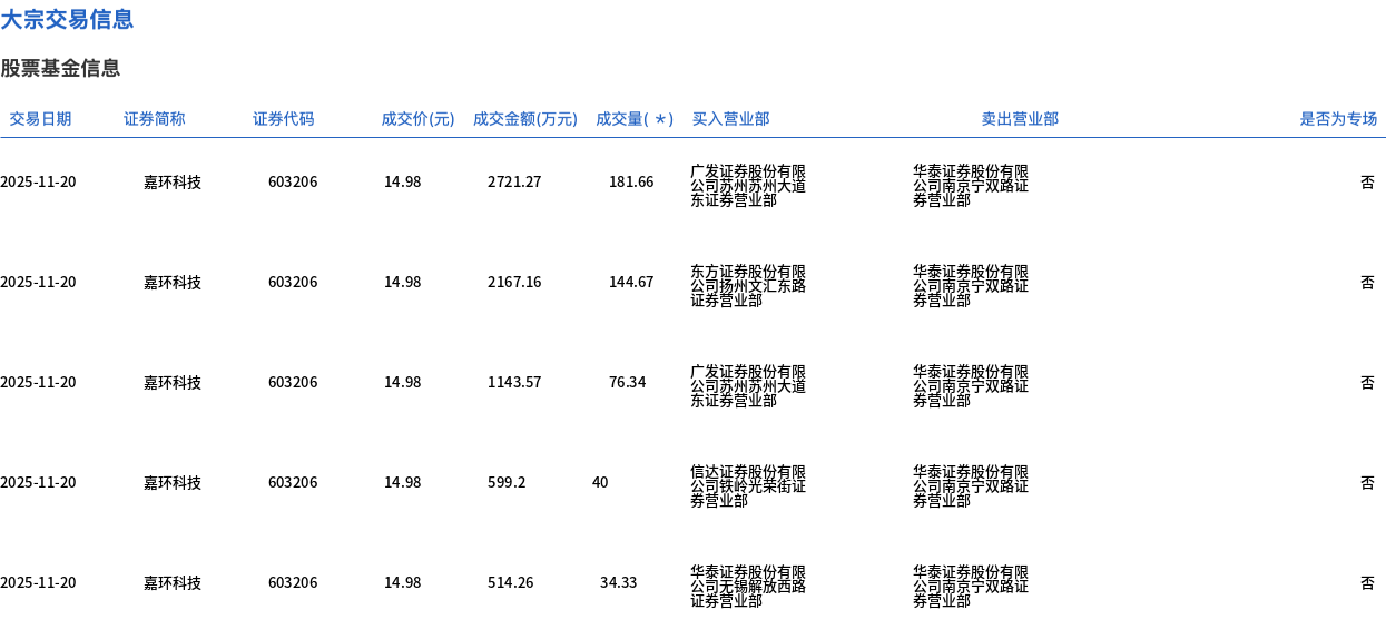 嘉环科技今日大宗交易折价成交477万股,成交额7145.46万元