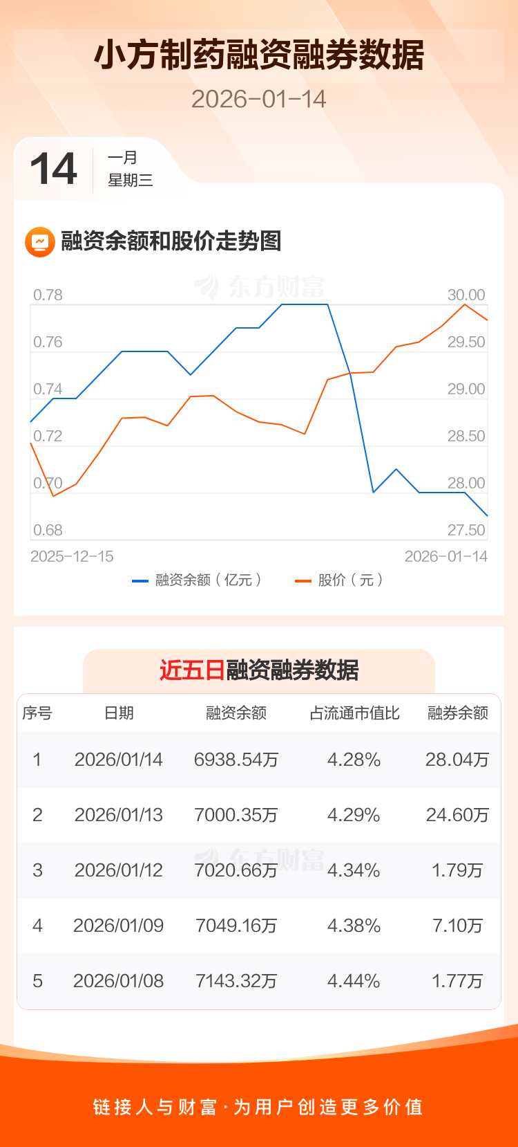 交易所最新数据显示,小方制药于2026年1月14日获融资买入623.89万元,融资偿还685.70万元,当日融资净偿还61.81万元。目前,该股融资余额6938.54万,占流通市值比例为4.28%。