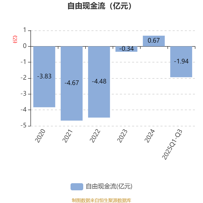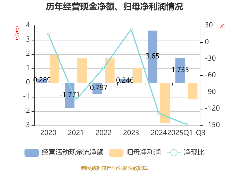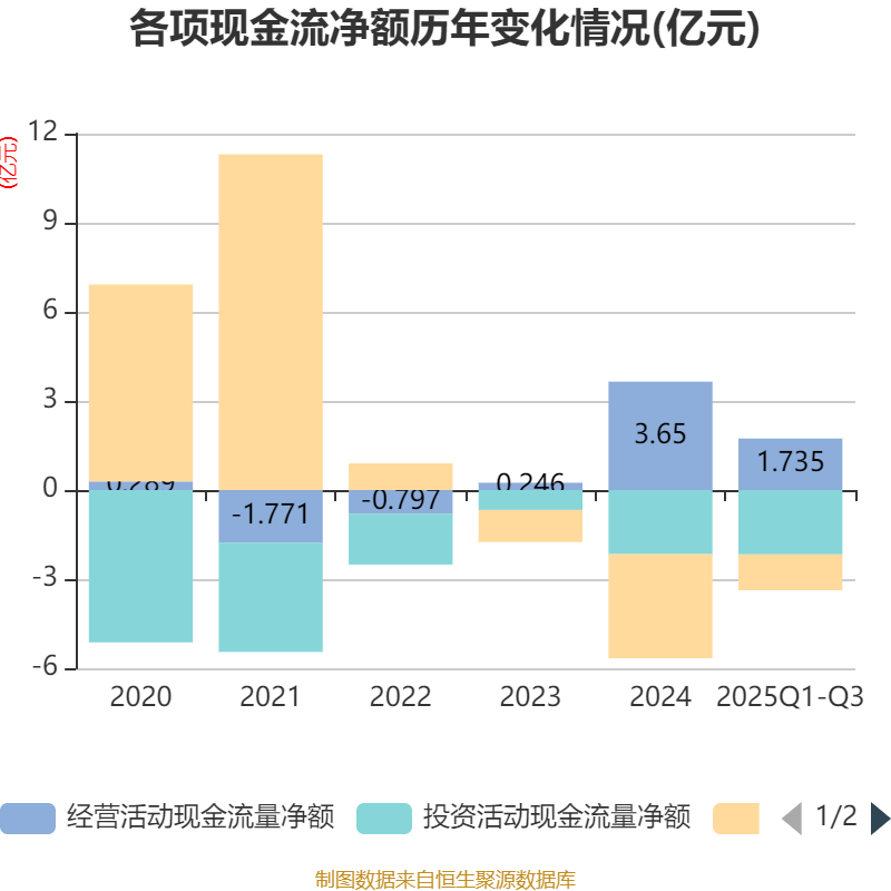 2025年前三季度,公司经营活动现金流净额为1.73亿元,同比下降48.88%;筹资活动现金流净额-1.21亿元,同比增加3.1亿元;投资活动现金流净额-2.17亿元,上年同期为-1.8亿元。