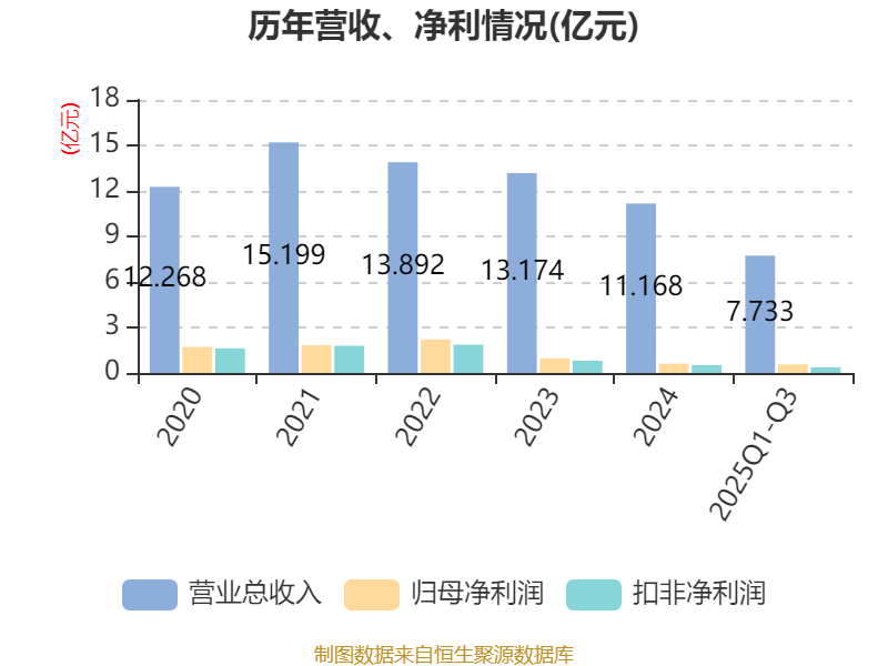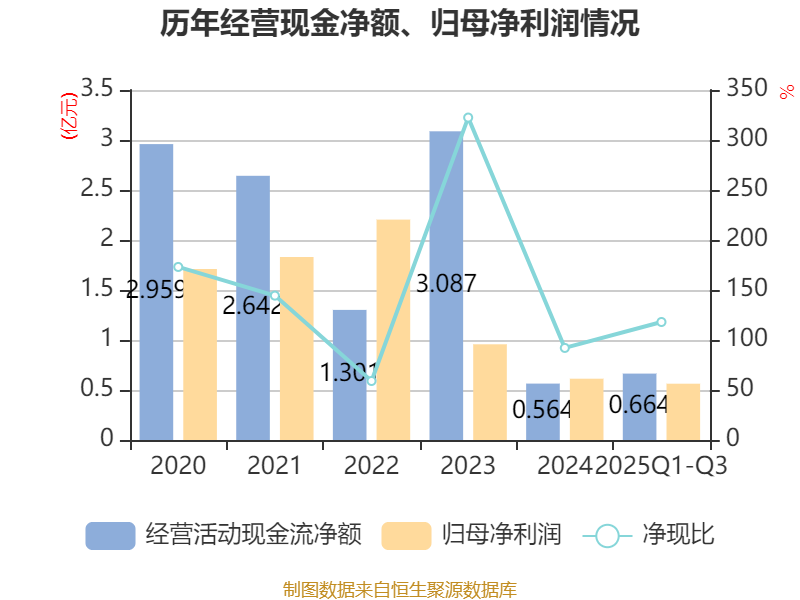 2025年前三季度,公司经营活动现金流净额为6643.64万元,同比增长29138.89%;筹资活动现金流净额-4453.8万元,同比增加3202.12万元;投资活动现金流净额-2220.31万元,上年同期为-3.73亿元。