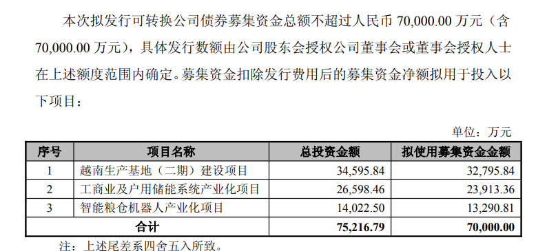 1月7日晚间,富佳股份(603219)公告,公司拟向不特定对象发行可转换公司债券募集资金不超过7亿元,募集资金扣除发行费用后的募集资金净额拟用于越南生产基地(二期)建设项目、工商业及户用储能系统产业化项目、智能粮仓机器人产业化项目。