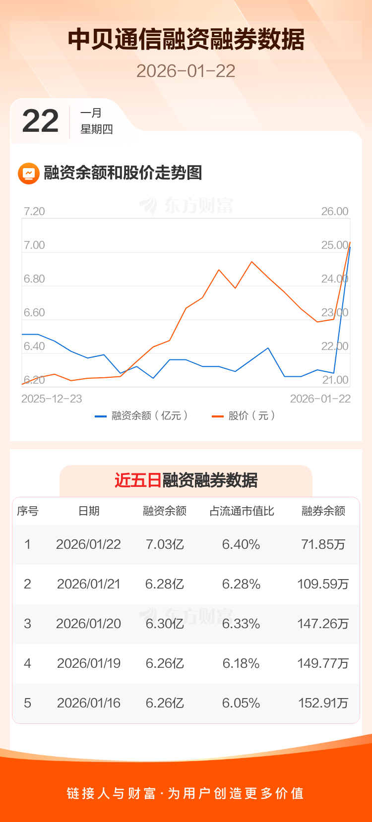 交易所最新数据显示,中贝通信于2026年1月22日获融资买入1.33亿元,融资偿还5831.00万元,当日融资净买入7469.77万元。目前,该股融资余额7.03亿,占流通市值比例为6.40%。