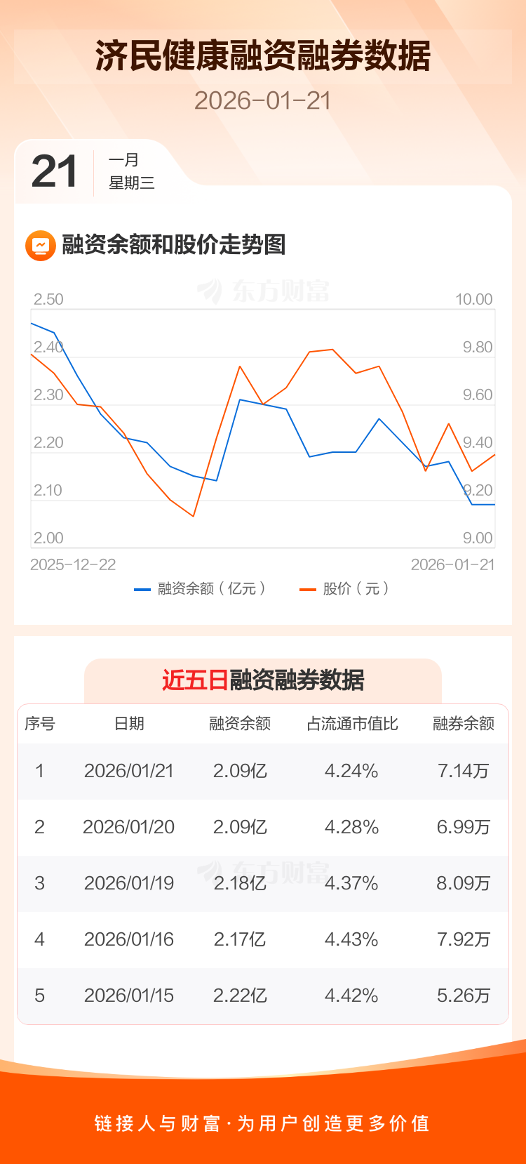 交易所最新数据显示,济民健康于2026年1月21日获融资买入541.09万元,融资偿还562.00万元,当日融资净偿还20.9万元。目前,该股融资余额2.09亿,占流通市值比例为4.24%。