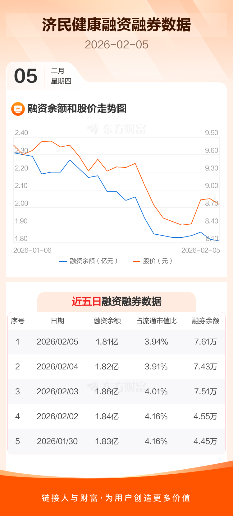 交易所最新数据显示,济民健康于2026年2月5日获融资买入526.12万元,融资偿还619.63万元,当日融资净偿还93.51万元。目前,该股融资余额1.81亿,占流通市值比例为3.94%。