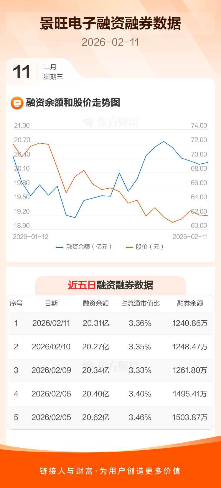 交易所最新数据显示,景旺电子于2026年2月11日获融资买入8744.71万元,融资偿还8412.09万元,当日融资净买入332.63万元。目前,该股融资余额20.31亿,占流通市值比例为3.36%。