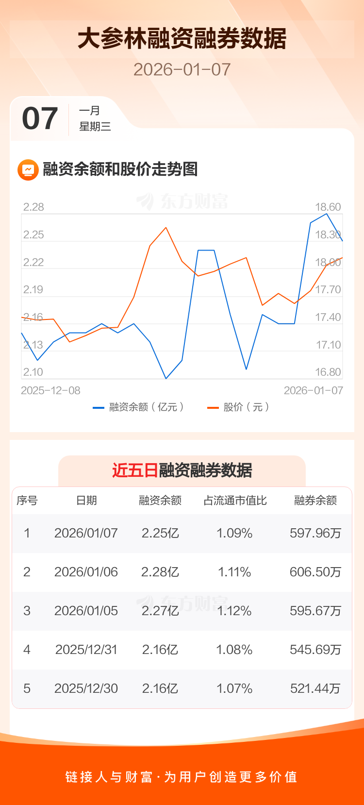 交易所最新数据显示,大参林于2026年1月7日获融资买入1665.93万元,融资偿还1963.66万元,当日融资净偿还297.73万元。目前,该股融资余额2.25亿,占流通市值比例为1.09%。