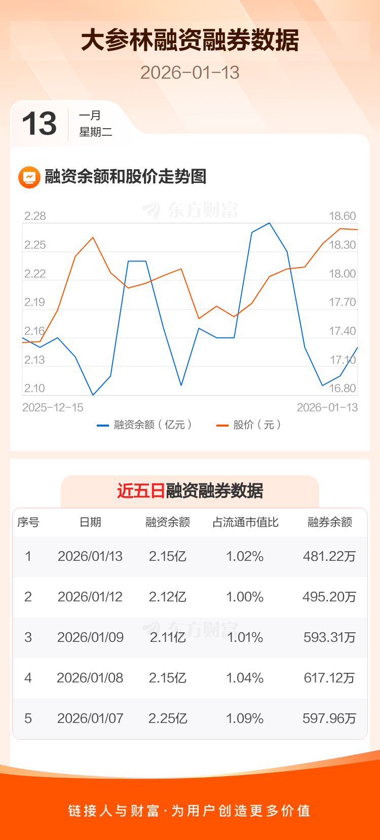交易所最新数据显示,大参林于2026年1月13日获融资买入973.59万元,融资偿还651.36万元,当日融资净买入322.23万元。目前,该股融资余额2.15亿,占流通市值比例为1.02%。