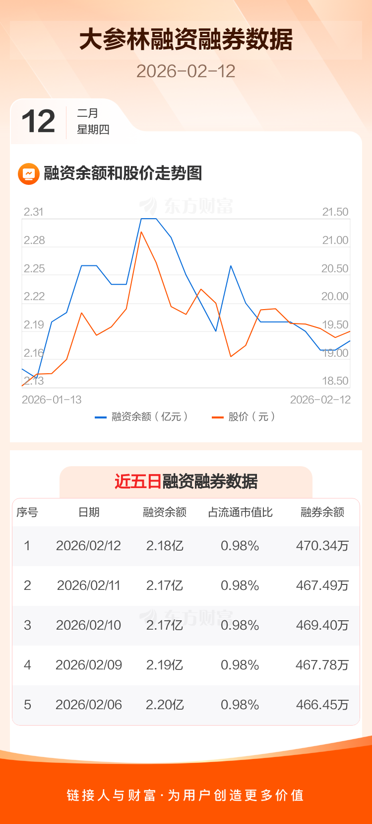 交易所最新数据显示,大参林于2026年2月12日获融资买入290.49万元,融资偿还253.27万元,当日融资净买入37.23万元。目前,该股融资余额2.18亿,占流通市值比例为0.98%。