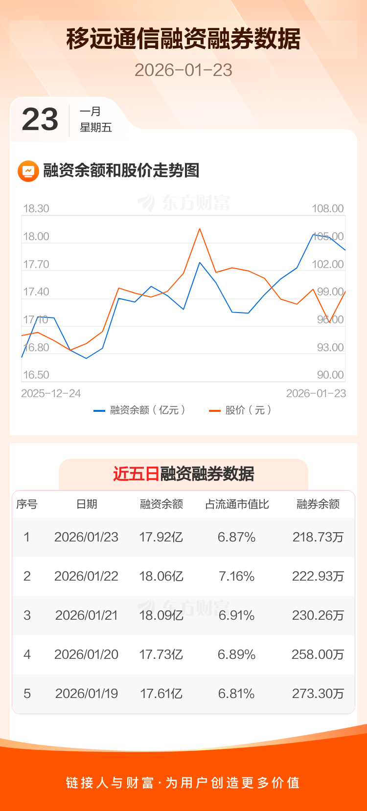 交易所最新数据显示,移远通信于2026年1月23日获融资买入2.20亿元,融资偿还2.35亿元,当日融资净偿还1438.55万元。目前,该股融资余额17.92亿,占流通市值比例为6.87%。