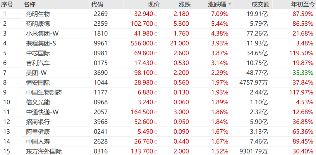 恒生指数成份股中65只上涨、21只下跌。其中,药明生物涨7.09%,药明康德涨5.44%,小米集团涨4.38%。