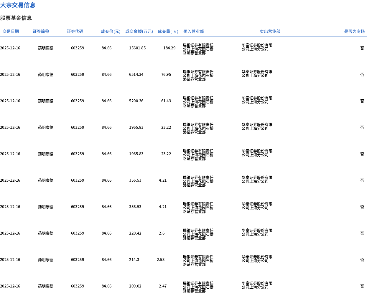 12月16日,药明康德大宗交易成交385.13万股,成交额3.26亿元,占当日总成交额的11.47%,成交价84.66元,较市场收盘价89.12元折价5%。