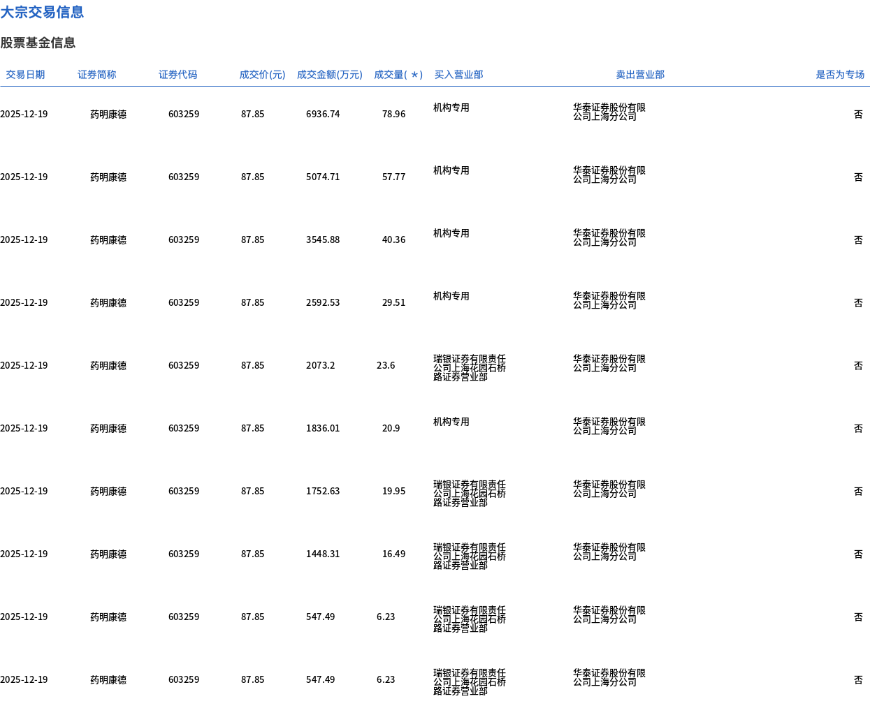 12月19日,药明康德大宗交易成交300万股,成交额2.64亿元,占当日总成交额的5.75%,成交价87.85元,较市场收盘价92.47元折价5%。